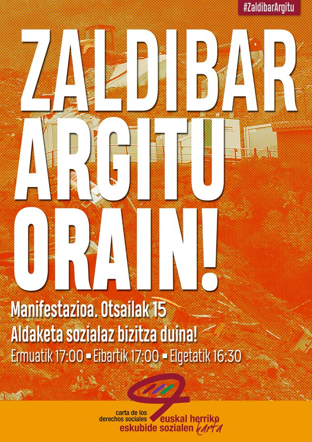Euskal Herriko Eskubide Sozialen Kartako eragileok biharko mobilizazioan parte hartzeko deialdia egiten dugu. Zaldibarren gertatutakoak erakusten du gure agintariek pertsonen, planetaren eta langileen bizitzaren gainetik jartzen dituztela beraien ezkutuko interesak. Lan eta bizitza duinagatik. ZALDIBAR ARGITU ORAIN!