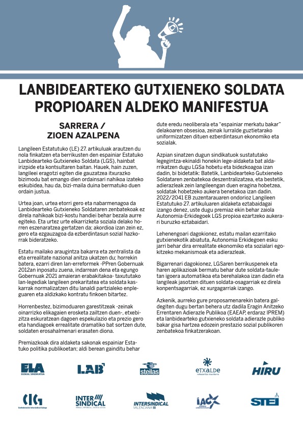 ELA, CIG, LAB, Steilas, Etxalde, Hiru, Intersindical Valenciana, Intersindical Catalana, IAC eta STEI sindikatuek manifestu bat adostu dute espainiar LGS hobetuko duen lurralde bakoitzerako LGS propioen alde (Espainiako LGS estatu guztirako gutxienekoa litzateke). Sindikatuok adierazi dutenez, “urtea joan, urtea etorri gero eta nabarmenagoa da Lanbidearteko Gutxieneko Soldataren zenbatekoak ez direla nahikoak bizi-kostu handiei behar bezala aurre egiteko”.