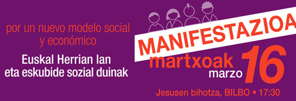 Hortaz, euskal jendarteari dei egiten diogu martxoaren 16an Bilboko kaleak zeharkatuko dituen manifestazioan parte har dezan. Manifestazioa Jesusen Bihotzetik abiatuko da arratsaldeko 17:30ean.