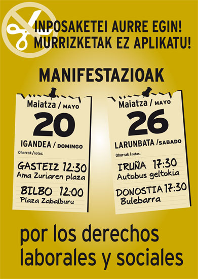 Gaur prentsaurrean euskal sindikatuek eta eragile sozial ezberdinek murrizketei ezetz esateko eta eskubide sozial eta laboralen alde borrokatzeko mobilizazio berriak iragarri dituzten. Maiatzaren 20an Gasteiz eta Bilbon manifestazioak izango dira eta maiatzaren 26an Iruñea eta Donostian.