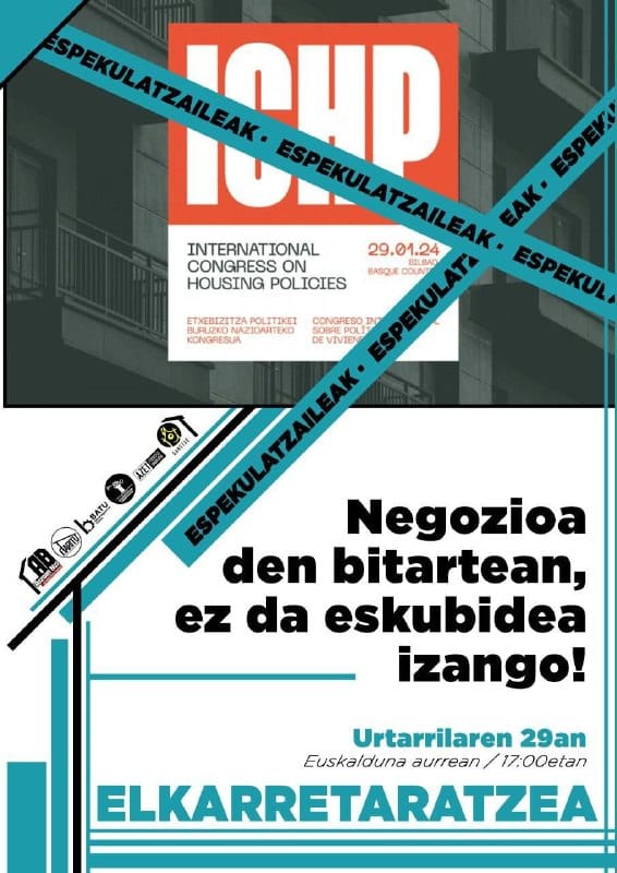 Gaur, urtarrilak 29, Eusko Jaurlaritzak International Congress on Housing Policies (Etxebizitza Politikei buruzko Nazioarteko Kongresua) inauguratu du. Kongresu horrek hitza emango die egungo egoeraren arduradun diren erakundeetako ordezkariei, eta, ohikoa den bezala, ez die jaramonik egingo urteetan eragile sozial eta sindikalek egin ditugun aldarrikapenei. Etxebizitza duina izateko eskubidea ez dago bermatuta, eta, beraz, premiazkoa da Euskal Herriko langileentzako etxebizitza duina eta irisgarria bermatuko duten egiturazko neurriak hartzea.