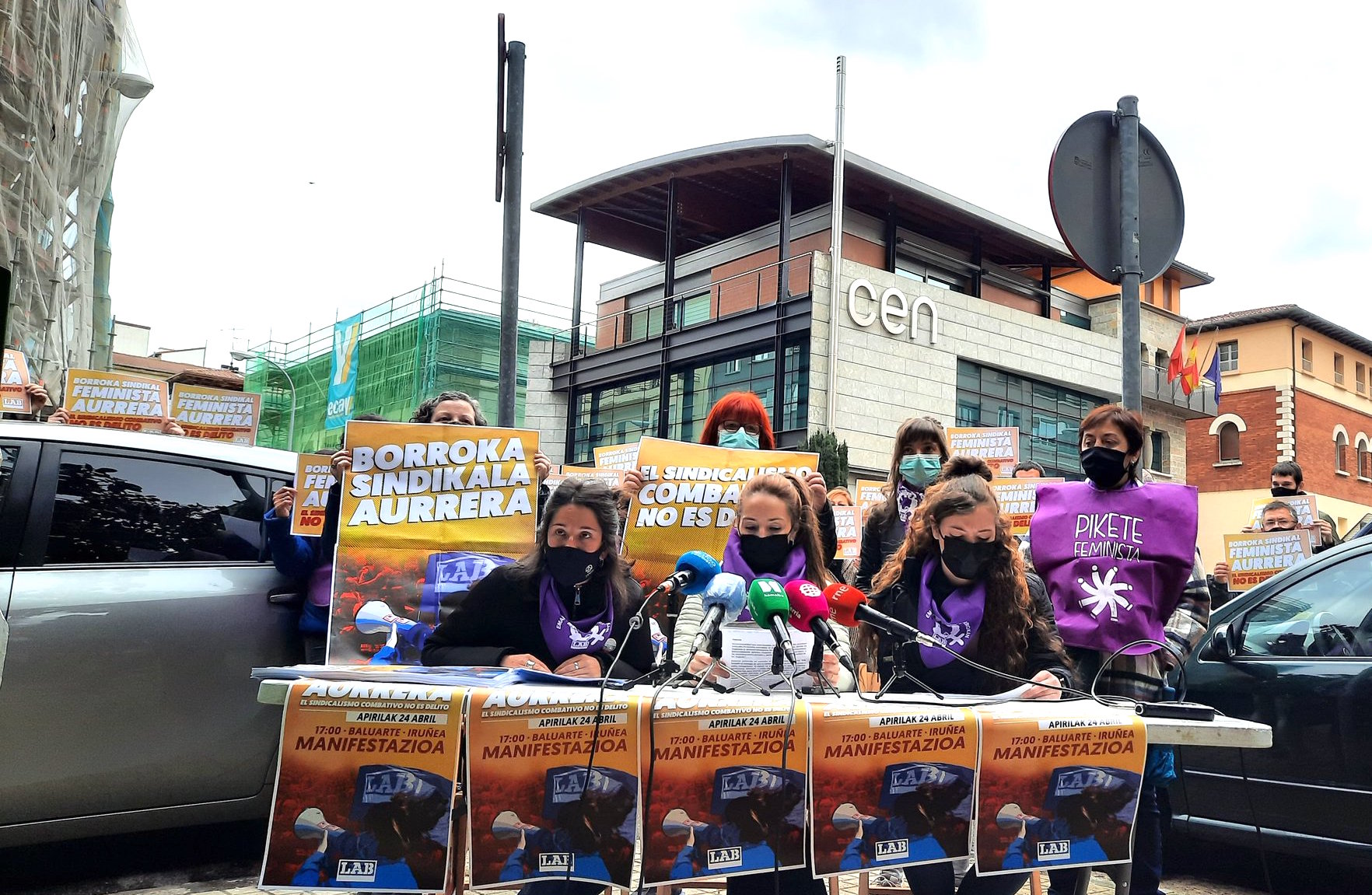 Iruñean LABen sindikalismo borrokalariaren kontra izandako polizia operazioaren harira, agerraldia egin dugu CEN Nafarroako Enpresaburuen Elkartearen aurrean, atxilotuek beraien eta sektore feminizatuetako zenbait delegatu eta langileen parte hartzearekin. Ostiralean hiriburu eta herrietan eta larunbatean Iruñean (17:00, Baluarte) mobilizatuko garela jakinarazi dute.