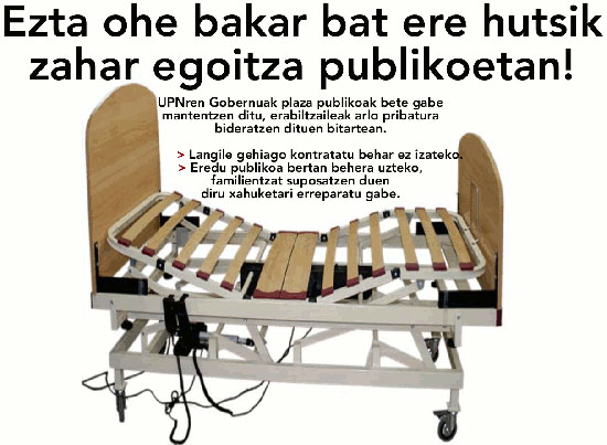 Gobernuak arlo publikoa pribatizatzen du. Adibide argi bat, Lizarrako Santo Domingo egoitzan dugu. Honetan dauden 100 plazetatik, 20 bete gabe mantentzen ditu, Lizarrako egoitza pribatua, betea eta itxaron zerrendarekin aurkitzen delarik. Publikoarekin azaltzen duen utzikeria hau, ez da kasualitatea, eredu pribatuaren sustapenean oinarritutako estrategiari erantzuten dio. Gobernuaren logikaren arabera, ohe gutxiago betez, langile gutxiago behar dira, beraz, libre dauden oheak hala mantentzekotan, ez da enplegu publiko gehiagorik sortu beharrik.