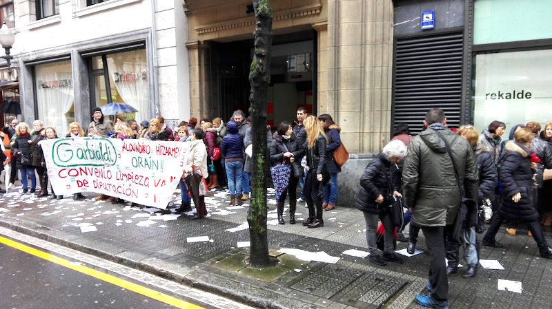 Bizkaiko Aldundiko garbiketaz arduratzen den Garbialdi azpikontratako langileek elkarretaratze bat egin dute gaur Bilbon, aldundiaren aurrean, eta hitzarmenaren negoziazioa 2012. urteaz geroztik blokeatuta dagoela salatu dute berriro. LAB, ELA, UGT, CCOO eta ESK sindikatuok deitu dugu mobilizazioa, eta abenduaz geroztik antolatutako protestekin dator bat.