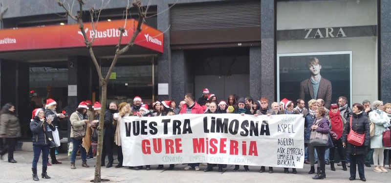 Bizkaiko Eraikin eta Lokalen Garbiketako langileek elkarretaratze bat egin dute gaur Bilbon, Lan Harremanen Kontseiluaren egoitzaren aurrean, patronalarekin negoziazioa hasi eta ordu erdi lehenago. Hain zuzen ere, "Vuestra limosna, gure miseria" lelopean egin dute protesta.