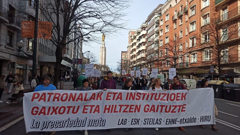 LAB, ESK, STEILAS, EHNE-Etxalde eta HIRU sindikatuek mobilizazioa egin dute gaur Bilbon, Jaurlaritzatik Confebasken egoitzaraino, “Patronalak eta instituzioek gaixotu eta hiltzen gaituzte” lemarekin. Bertan izan da Garbiñe Aranburu LABeko koordinatzaile orokorra eta langileon lan osasuna okerrera doala adierazi du. Urte hasieratik Euskal Herrian hildako 14 langileak gogoan, adierazi du latza izaten ari dela urte hasiera eta “hau ez da zerbait puntuala, buelta ematea lortzen ez den joera baten adierazle gordinena da”.