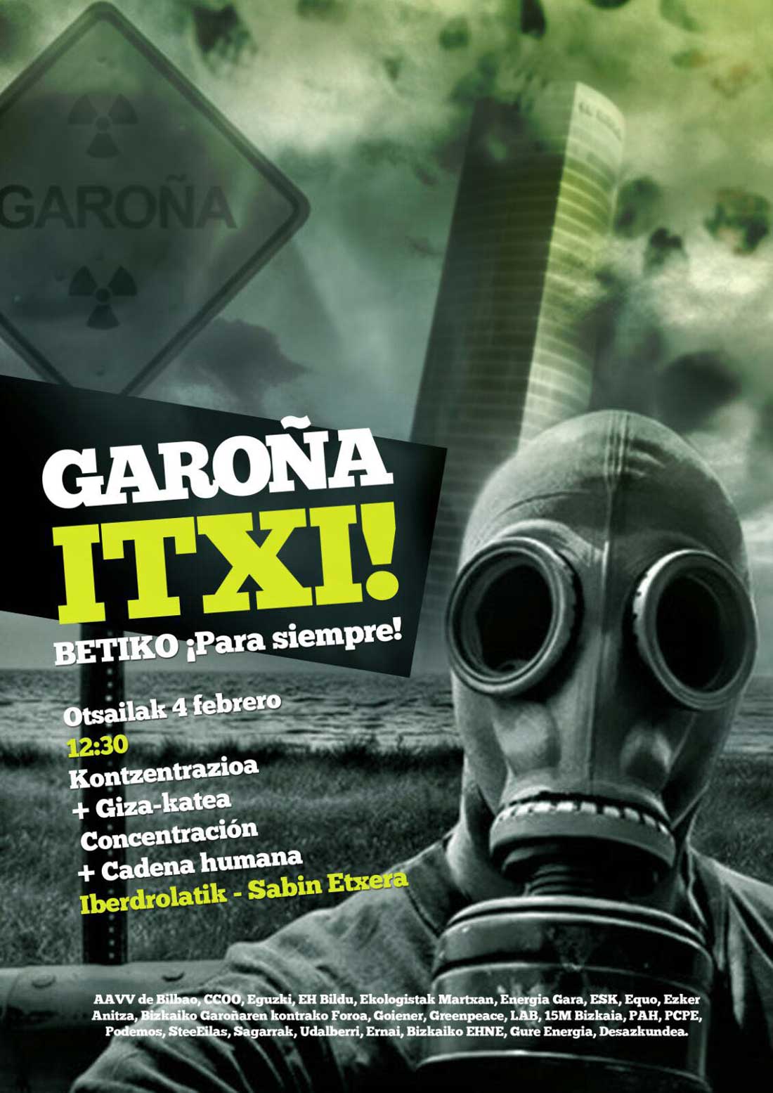 Denon inplikazio eta konpromisoa behar da Garoña ez zabaltzeko. Hau aldarrikatuz hainbat elkarte, sindikatu eta alderdik dei egiten diegu euskal herritarrei otsailaren 4an, larunbatean, Bilboko Euskadi Plazan 12:30etan egingo den kontzentrazioan parte hartzera. Ondoren, giza kate bat egingo dugu Euskadi plazatik Sabin Etxeraino, Errekalde zumarkalean dagoen PSOEren egoitzatik pasatuz.