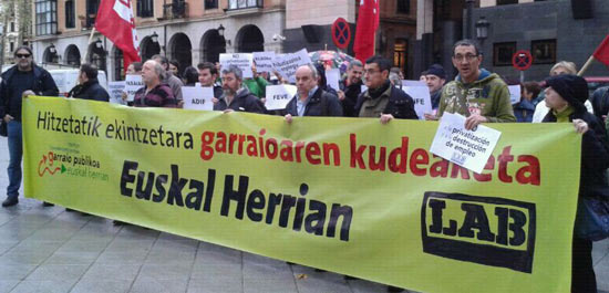 Administrazio zentralaren menpeko den garraio publikoaren kudeaketa eta defentsa Hego Euskal Herrira ekartzeko beharra aldarrikatu du LAB sindikatuak gaur Sabin Etxearen aurrean.