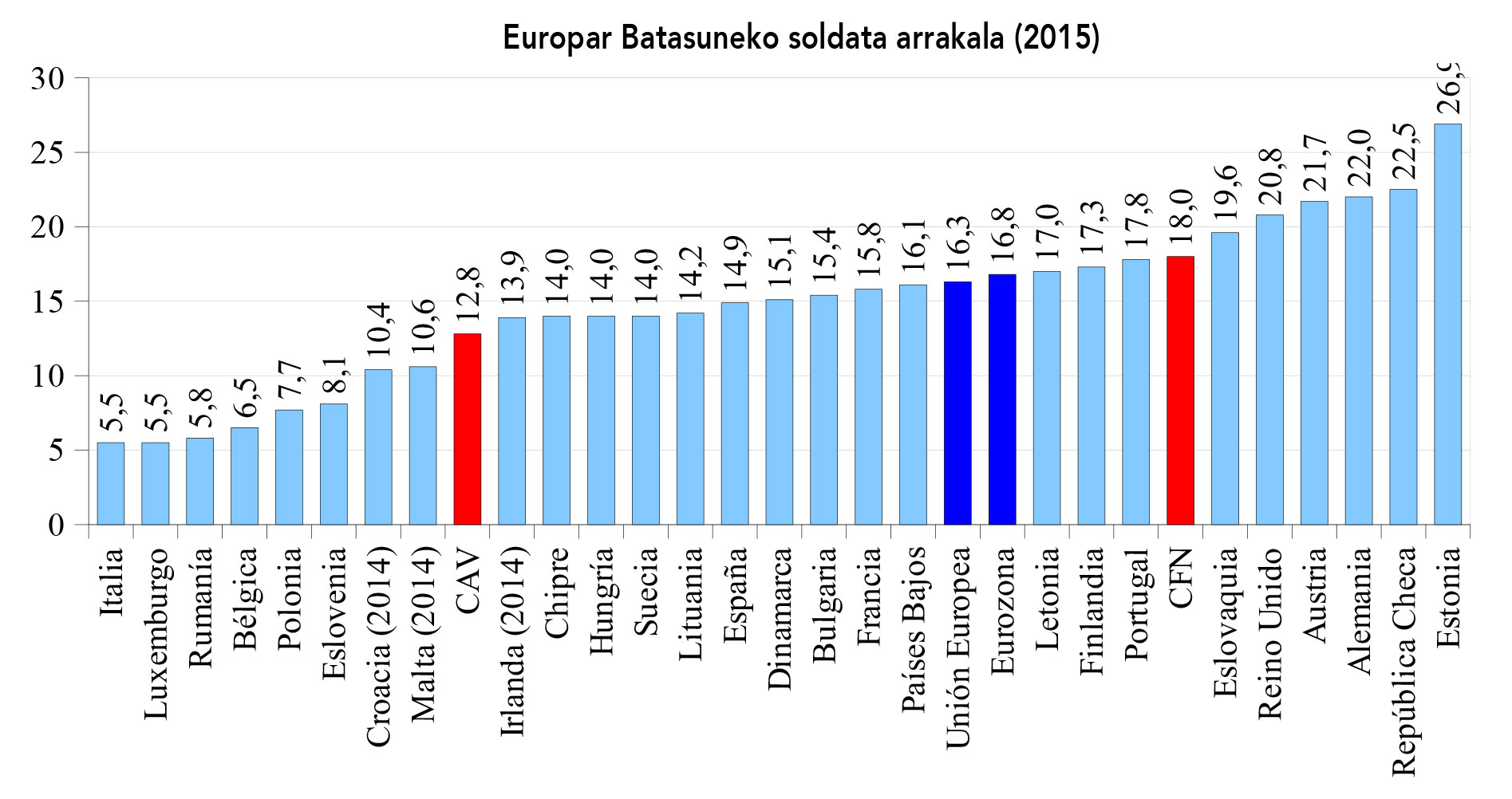 (*) EUROSTATek kide diren estatuetako soldata arrakala kalkulatzen du 10 langile edo gehiago dituzten enpresetako datuak soilik hartuta (Txekiar errepublikarako kenduta). Hego Euskal Herriko datuek ez dute kontutan hartzen enpresen tamaina.