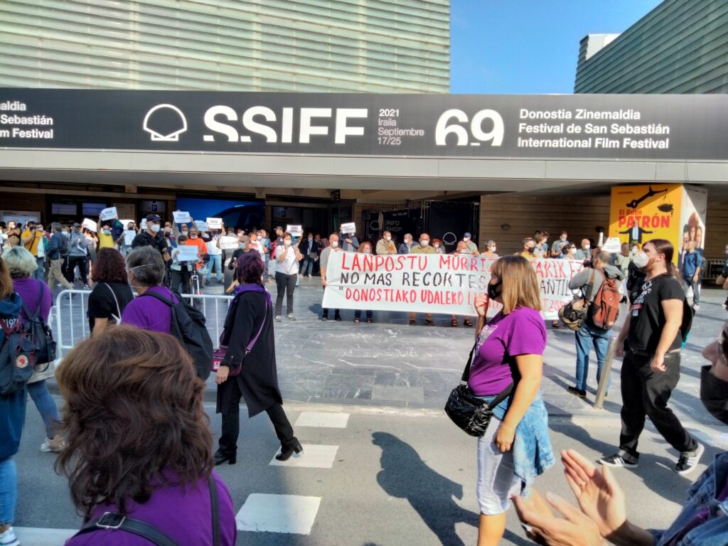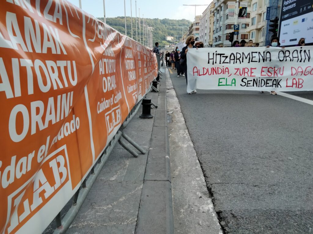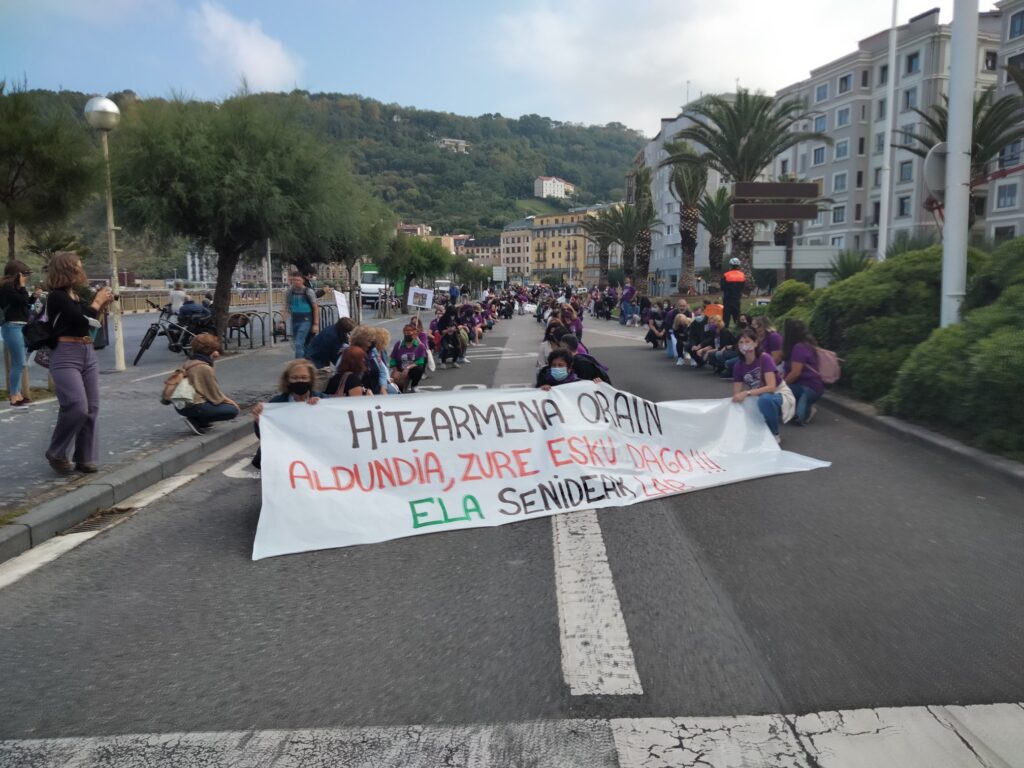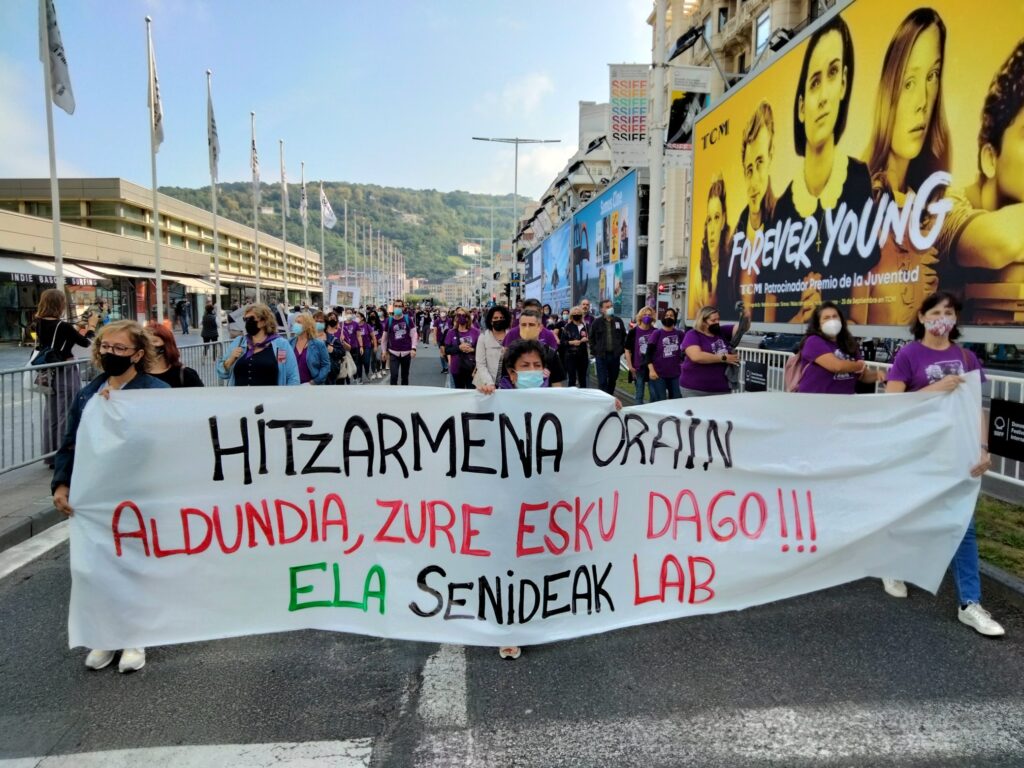 Lehen greba egunean, manifestazioa egin dugu Donostian, Sagues eta Gipuzkoako Foru Aldundiaren Jauregiaren artean, Zinemaldiko egoitza nagusietatik igarota. Hala, helduen egoitzen gatazka eta langileen egoera larria are eta gehiago jendarteratu dugu.