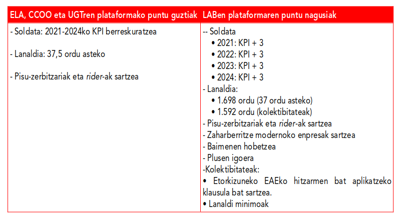 ELAk, CCOOk eta UGTk plataforma bateratu bat aurkeztu zuten zeinetan hiru puntu baino ez dituzten jaso: soldata (KPI), rider eta pisuko zerbitzarien inklusioa eta 37,5 orduko asteko lanaldia. Hiru sindikatu horiek proposamen hori egin zuten, aldarrikapen eta esparru asko alde batera utzita. Horren ondoren, patronalak proposamen bat aurkeztu zuen azaroaren 14an, erosteko ahalmena bermatzen ez zuena, urteko lanaldia bi orduz murrizten zuena eta aldi baterako ezintasunen osagarria 30. egunetik aurrera izatea proposatzen zuena.