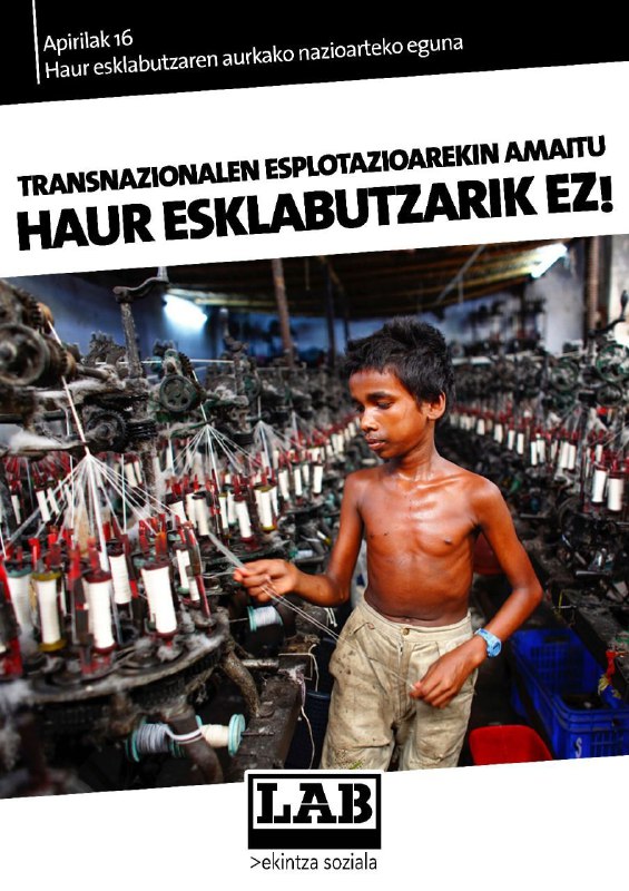 Apirilaren 16a, Haur Esklabotzaren Aurkako Nazioarteko Eguna da; egun honen harira, LABek haurrek sufritzen duten esplotazio mota hau salatu nahi du. Haurren esklabotza zuzenean lotuta dago munduan inposatzen ari den eredu neoliberal basatiarekin eta politika neokolonialistekin. Esklabotza, produkzio sistema bezala ulertua, enpresa transnazionalen etekinen oinarrian dago, eta, beraz, erantzukizun zuzena dute. Zentzu horretan, LAB esplotazio forma guztien kontrako borrokan berresten da, eta bestelako eredu sozial baten aldeko pauso irmoak ematen jarraituko du sindikatuak.