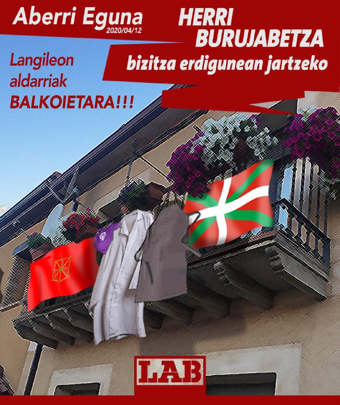 Aurtengo Aberri Eguna koronabirusak eragindako salbuespen egoerak baldintzatua dator. Bada, ez dugu utziko krisi hau langileok ordain dezagun. Krisi honen amaieran politika neoliberaletan sakontzeko asmoa izango dute patronalek zein instituzioek, baina Euskal Herriko langileok bizitza erdigunean jarriko duen eredu baten aldeko borrokari eutsiko diogu. Herri burujabetza nahi dugu, bizitza erdigunean jartzeko. Kapitalaren zerbitzura aritzen diren Estatu bien eta euren menpeko administrazio autonomikoen aurrean, herri burujabetza eta berau ahalbidetuko duen Errepublika independente, sozialista eta feminista aldarrikatzen dugu. Batera-k egindako deiaren haritik, Aberri Egunean Ikurrinarekin eta Nafarroako banderarekin batera, geure balkoiak langileon aldarrikapen anitzekin janzteko deia egiten dugu LABetik.
