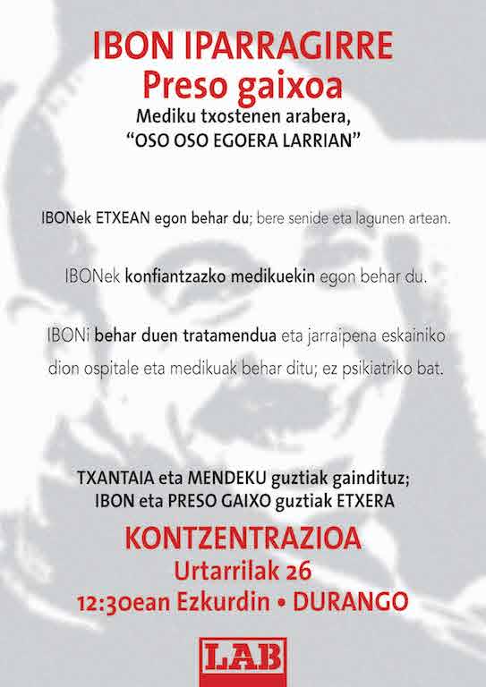 Ibon Iparragirreren askatasuna exijituko dugu, ostiralean, Durangon