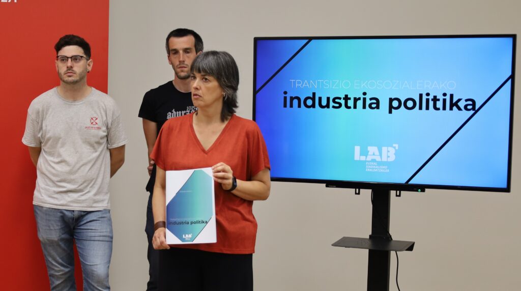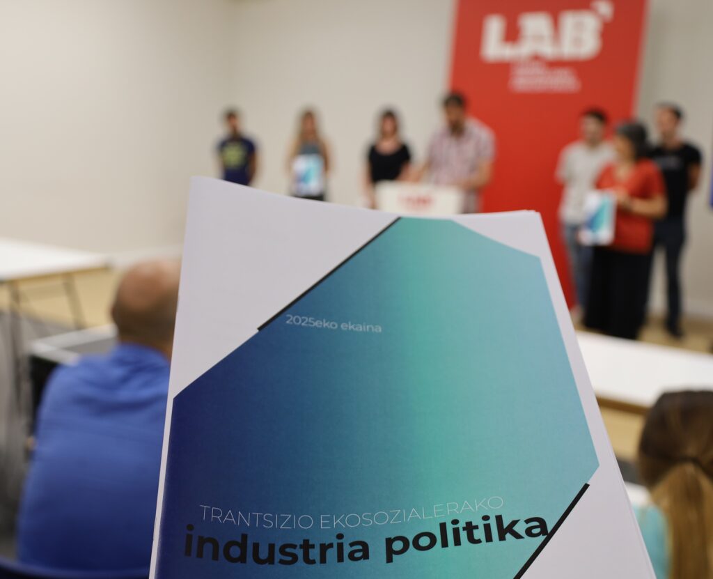 Trantsizio ekosozialari erantzungo dion industria politika zein oinarriren gainean eraiki behar litzatekeen jasotzen duen proposamena aurkeztu du LABek, Bilbon. Igor Arroyo LABeko koordinatzaile orokorrak azaldu duenez, modu honetan labur daitezke egungo politikak: “diru publiko gehiago eta betebehar gutxiago enpresentzat”. Horrek, baina, ez ditu ez trantsizio ekosoziala eta ezta enplegua bermatzen ere, azaldu duenez: “Enpresek laguntza gehiago eskatzen dituzte, irabaziak lehenesten, trantsizioa moteltzen eta enplegua prekarizatzen duten bitartean”.