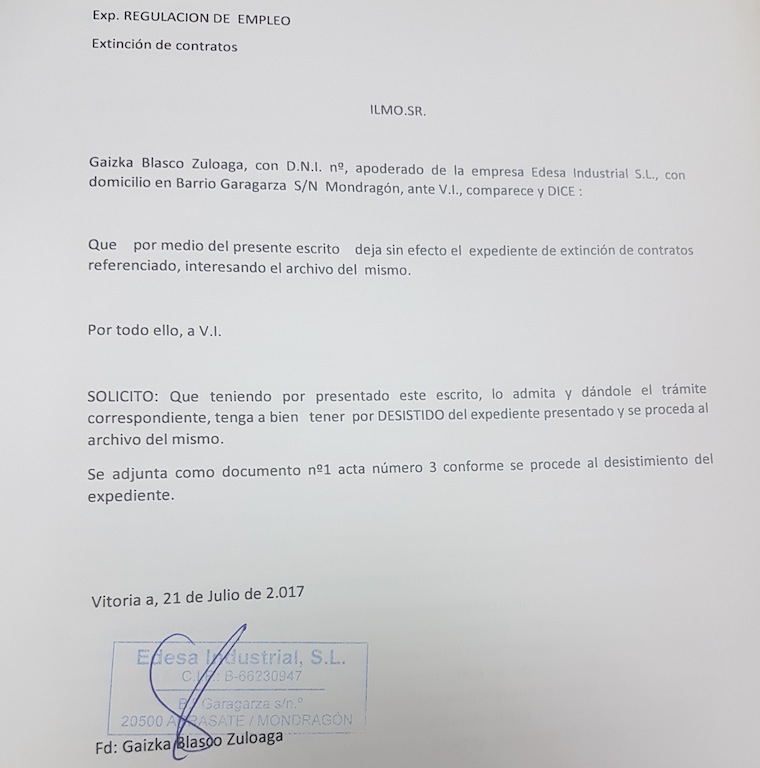 Gaur helarazten dizuegun eta enpresak igorritakoa jasotzen duen idatziak, atzo geniona baieztatzen du. Hau da, iraungitze EEEaren atzera bota dela eta mahai bat osatuko dela Fagor-CNA enpresarentzat proiektu berri bat sortzeko helburuarekin, beti ere enplegua eta etorkizunerako bermeak oinarri hartuta.