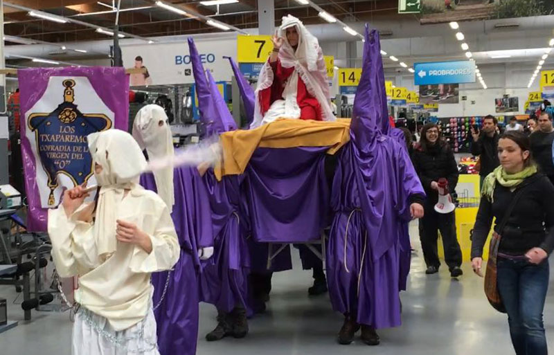 0aren birginak, Aste Santuko pertsonaietaz lagunduta eta “Chaparemos”ek eramanda, egun hauetako prozesioa Decathlonera eraman genuen enpresak irekitzeari utzi eta kontsumitzaileei horrelako egunetan eros ez dezaten eskatzeko. 0aren Birginak, denak zoriontsu gauden eta familia artean pasatu nahi ditugun egun hauetan, Decathlonek irekitzeagatik, hala behartuta, langile askok lanean pasa beharko dituztela salatu zuen.