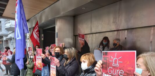 Protesta egin dugu Eusko Jaurlaritzaren Bilboko egoitzaren aurrean, ikastetxe publikoetako eskola-jangeletako langileen lanpostuak arriskuan daudela ohartarazteko.