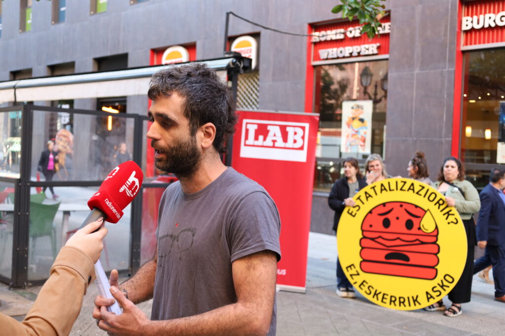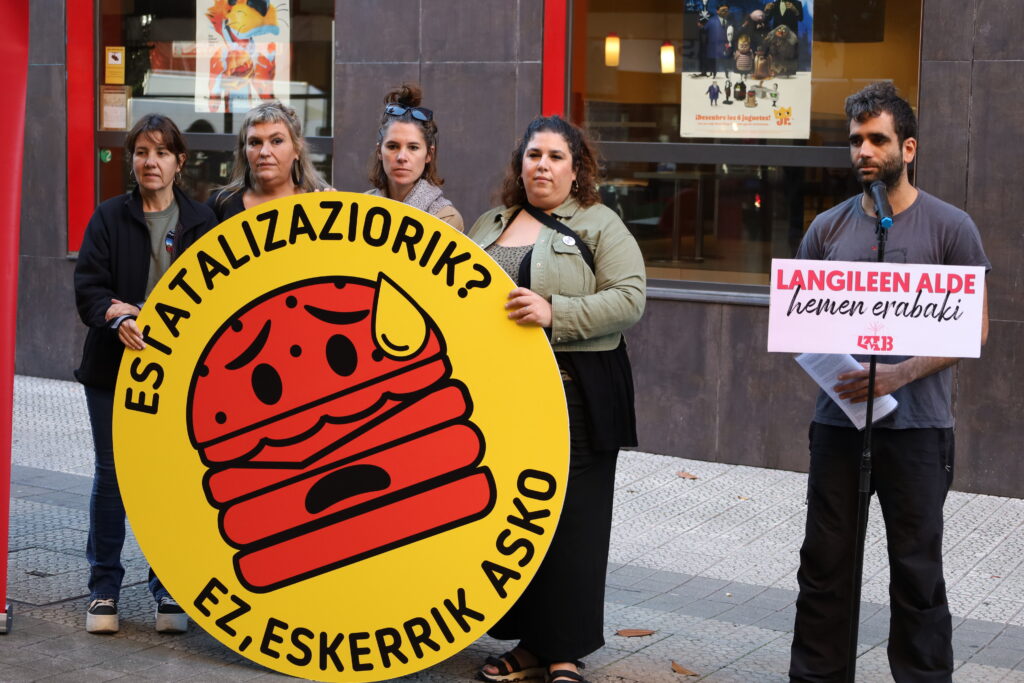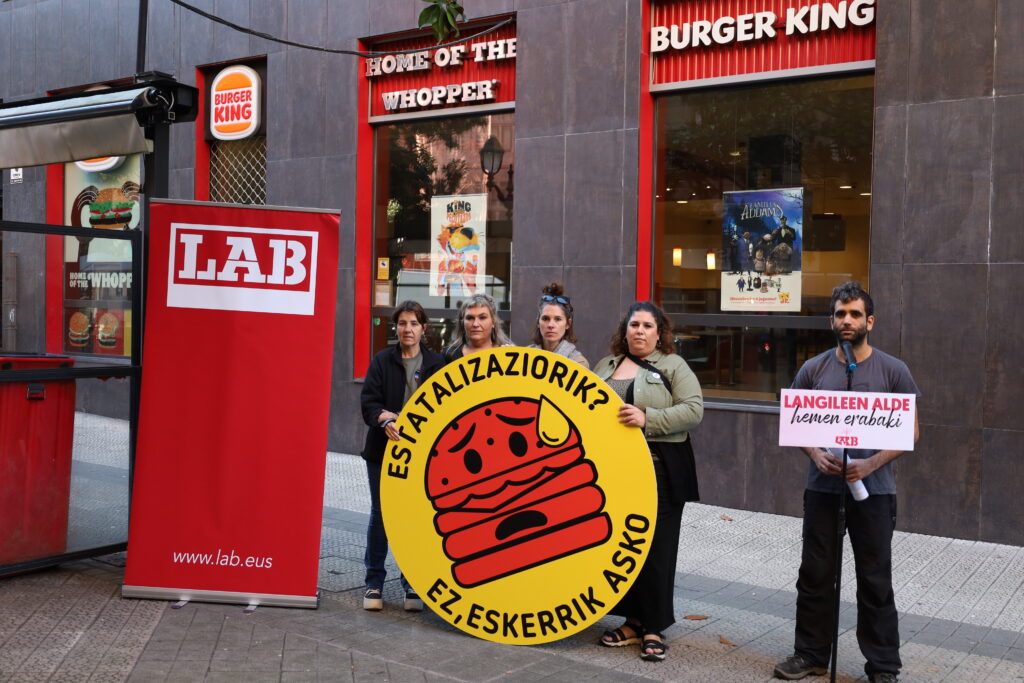 Agerraldia egin dugu gaur Bilbon, Egaña kaleko Burguer King-en aurrean, “Bizkaiko ostalaritzan, estatalizaziorik ez! Lan berdina, hitzarmen berdina” lemarekin.