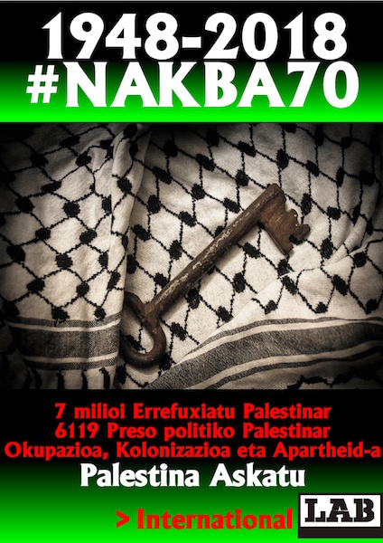 Gaur palestinarrek hondamendia deitzen dioten NAKBA egunaren 70. urteurrena da. Nakba edo palestinar exodoa Palestinako Britainiar Mandatuaren gerra zibilean (1947-1948) eta 1948ko Arabiar-israeldar Gerran zehar gertatu zen 700.000 palestinar baino gehiagok bere etxetik egotzi edo ihes egin zutenean. Gaur egun Nakba horren ondorioz 7 milioi errefuxiatu palestinar daude.