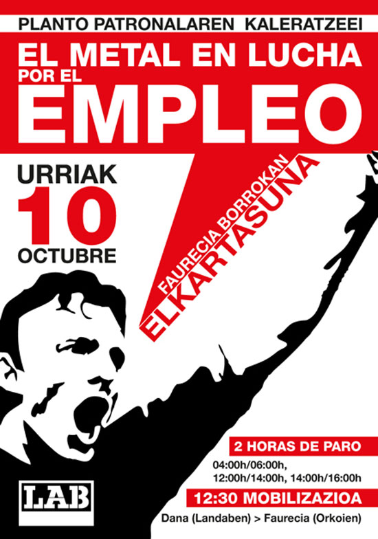 Hoy 4 de octubre el sindicato LAB ha procedido a registrar 2 horas de paro por turno en el sector del metal en la comarca de Pamplona. Dichos paros se realizarán el próximo jueves 10 de octubre. El motivo de la convocatoria es mostrar la solidaridad y dar impulso a la lucha que los trabajadores y trabajadoras de Faurecia Orkoien están llevando a cabo en favor de sus puestos de trabajo y de unas condiciones de trabajo dignas.