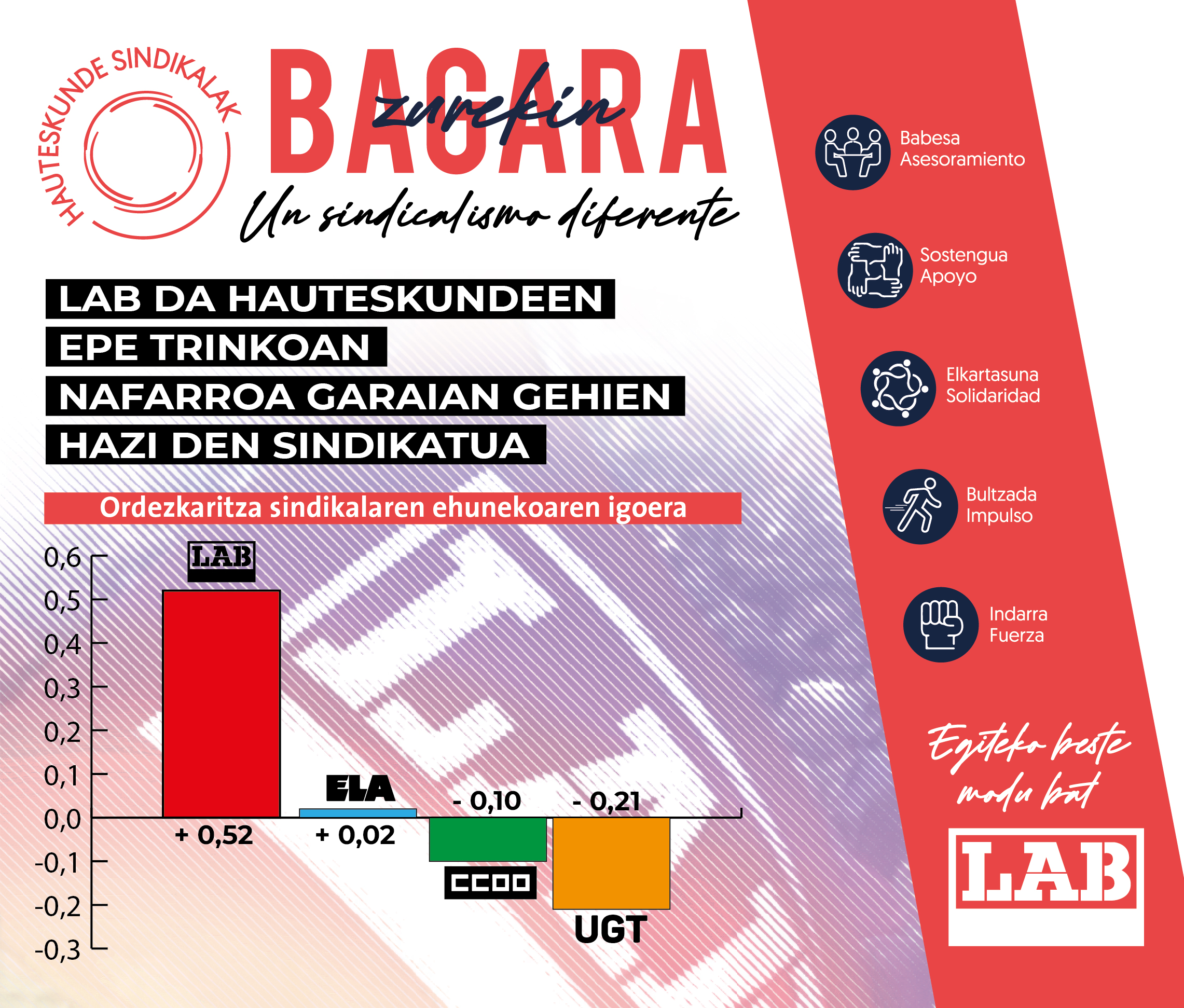 Iritsi berri diren maiatz amaierako datu ofizialek argi adierazi dute LAB dela Nafarroa Garaiko hauteskunde sindikalen epe trinkoan gehien hazi den sindikatua. 2022ko abuztuaren 31tik 2023ko maiatzaren 30era Nafarroako ordezkaritza sindikalaren %45 berritu da. Bederatzi hilabete erabakior horietan, CCOO eta bereziki UGT jaitsi eta ELA mantendu den bitartean, LABek puntu erdia irabazi du.