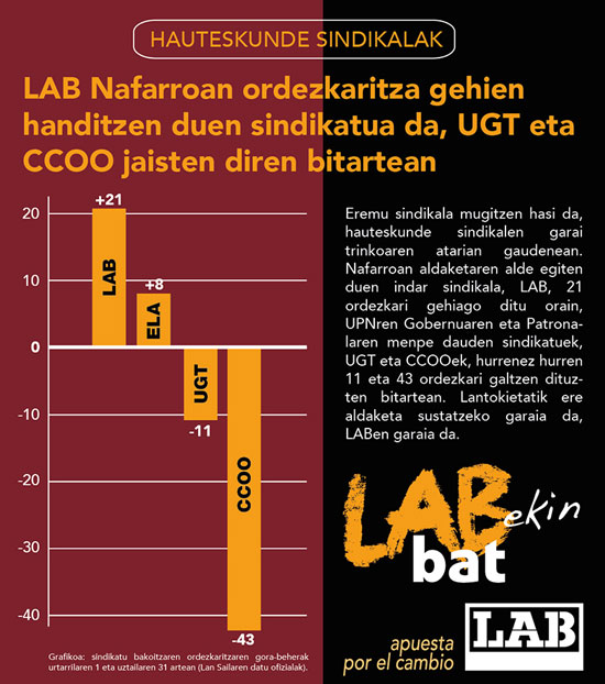 Eremu sindikala mugitzen hasi da, hauteskunde sindikalen garai trinkoaren atarian gaudenean, atxikitutako agiri ofizialetan ikus daitekeenez. 2013ko abenduaren 31tik 2014ko uztailaren 31ra dauden zazpi hilabeteetan, Nafarroan aldaketaren alde egiten duen indar sindikalak, LABek 21 ordezkari gehiago lortu ditu, UPNren Gobernuaren eta Patronalaren menpe dauden sindikatuek, UGT eta CCOOek, hurrenez hurren 11 eta 41 ordezkari galdu dituzten bitartean.