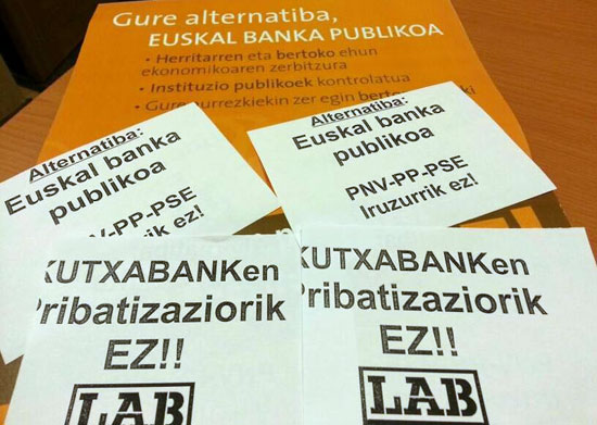 LAB sindikatuak gaur ekimena egin du Durangaldeko Kutxabank-eko sukurtsal guztietan. Pribatizariaren aurka, eta euskal banka publikoaren alde, oktabilla informatiboak banatu ditu Durango, Iurreta, Ermua, Zornotza, Abadiño, Mallabia, Zaldibar eta Elorrion.