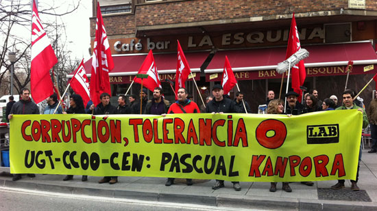 Delegados y delegadas del Sindicato se concentran frente a las sedes de UGT, CCOO y Patronal. LAB presentará una moción en los comités de empresa para pedir una rectificación.