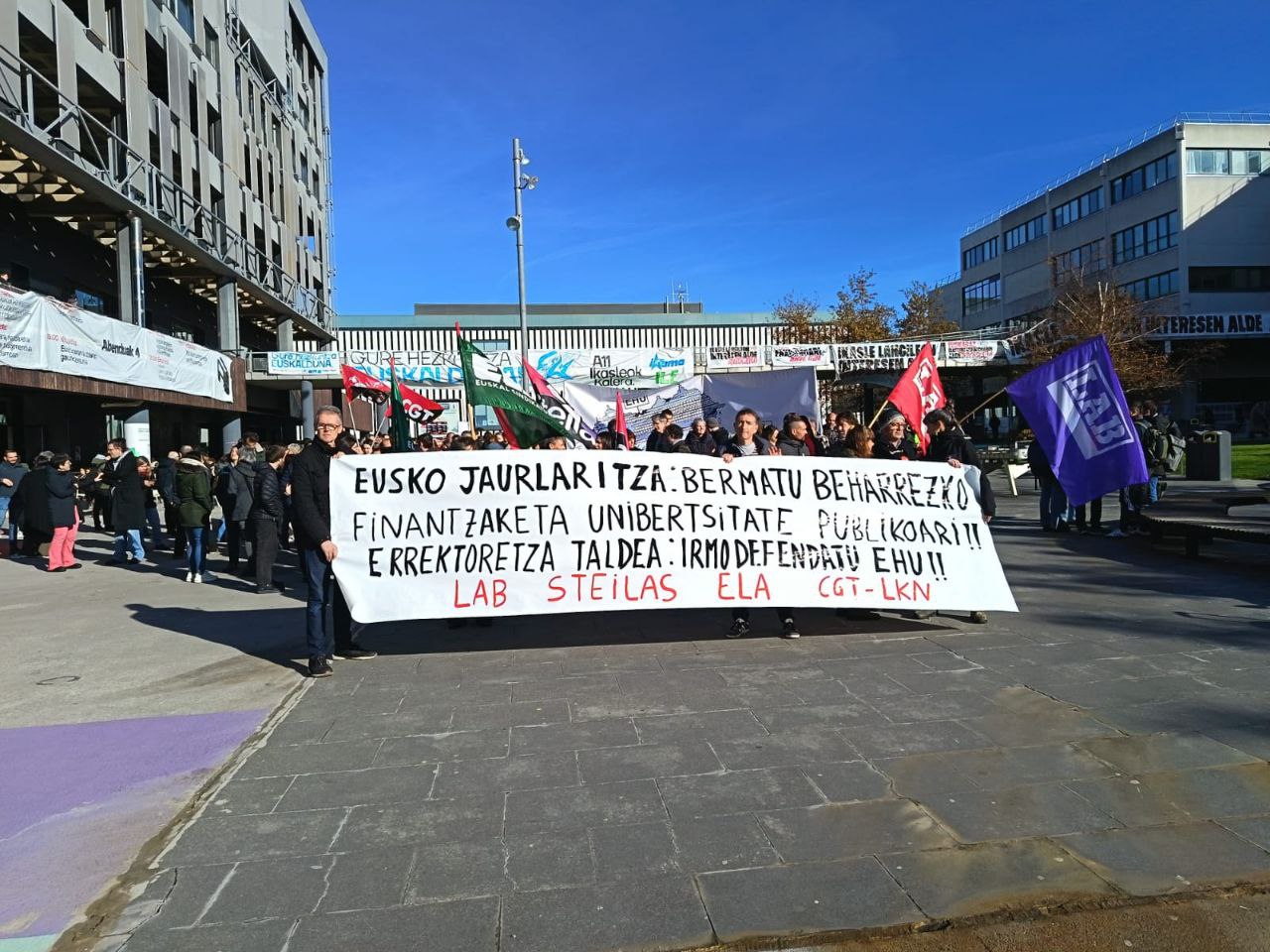 Horregatik guztiagatik, LAB, STEILAS, ELA eta CGT/LKN sindikatuok, euskal jendarteak behar duen unibertsitate publikoa beharrezkoa duen finantzaketa bermatzea exijitzen diogu Eusko Jaurlaritzari. Gaur, Leioan, egin dugu lehenengo mobilizazio eguna. Bihar, abeduaren 2an Donostian, 3an Gasteizen eta 4an Eusko Jaurlaritzaren ordezkaritzaren aurrean, Bilbon, egingo ditugu lanuzteak 11:00etatik 12:00etara, eta, kontzentrazioak 11:15etan izango dira. EHUko kideok badugu eskaera hau ozen adierazteko garaia!