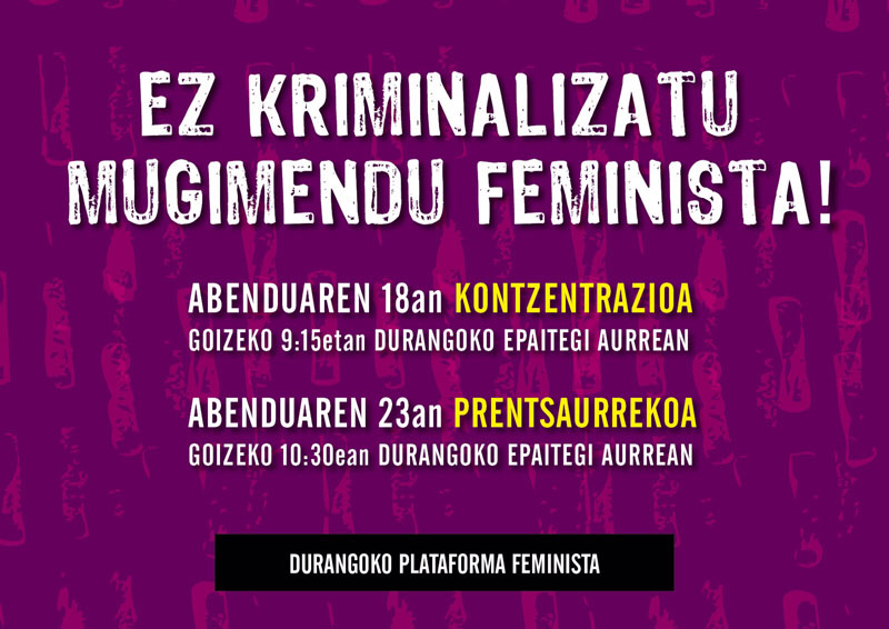 LAB sindikatuak Durangoko mugimendu feministak abenduaren 18an, 9:15etan, Durangoko epaitegi aurrean egingo duen mobilizazioa babestu eta bertan parte hartzeko deia egiten du langile mugimenduak ezin baitu inolako eraso matxistarik onartu; ezta erasotzaileak bere burua biktima bihartu nahi izatea ere.