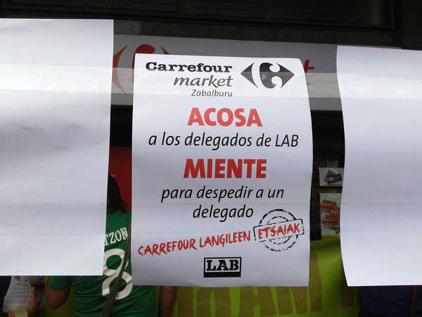 LABek Carrefour erakusten ari den sindikatuen aurkako jarrera publiko egin eta salatu nahi du. Enpresak Bilboko Zabalburuko bere dendako LABeko delegatu bat zigortu du, berau kaleratu asmoz. Langileen ordezkari honek 25 urte baino gehiago daramatza enpresan lanean.