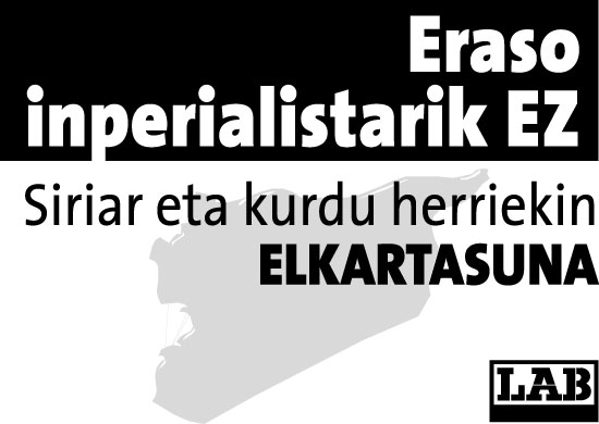 Siriar herria eta herri kurdua izan behar dira euren etorkizunaren jabe bakarrak. Ezin daiteke iraganeko eskema kolonialistetara bueltatu. Siriaren aurkako erasoa, gerora Iran eta Libano erasotzeko atarikoa litzateke eta horrela, Ekialde Ertainean erregimen titereak ezarri Estatu Batuen, Israelen eta Europar Batasunaren interes inperialistak defendatzeko. Egoera honen aurrean, munduko herriok eta langile klaseak ezin gara egon ezer egin gabe. Ez dago tarteko biderik.
