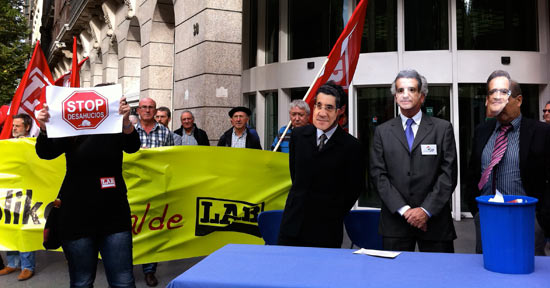 LAB sindikatuak parodia-protesta egin du gaur Kutxabanken aurrean PNV eta PPk, PSEren babesarekin, Euskal Kutxen izaera publikoari amaiera ematen dion onartutako akordioak dakartzan ondorioak irudikatu eta salatzeko. Akordio hori tarteko kutxak akziodunen eta espekulatzaileen eskuetara pasako direla eta pribatizazio politika horien ondorioz kutxen bideragarritasuna ere kolokan jarri dela salatu du sindikatuak. "Kutxen obra soziala galbidean jartzen da akordio honekin eta obra sozialik gabe, kutxen benetako izaera galtzen da".