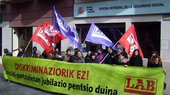 LABek, pasadan otsailaren 7an Bilbo, Iruñea eta Donostian egin bezala, lanaldi partziala duten langileen artean espainiar araudiak eragiten duen diskriminazio salatzeko mobilizazioa egin zuen atzo Gasteizko Gizarte Segurantzaren bulegoen aurrean.