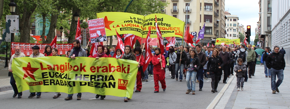 Manifestazio nagusiena 12:00etan abiatu da Gaztelu Plazatik, beste horrenbeste borroka eremu ordezkatzen duten bost blokez osatuta: Zerbitzu pribatuak; Industria; Zerbitzu Publikoak; Gazte, langabe eta prekarioak; eta Pentsiodunak. Manifestazio amaierako ohiko mitinaren ordez, bloke bakoitzeko ordezkari banak hartu du hitza Gaztelu Plazako Kioskotik, eguneroko borroka sindikalaren garrantzia nabarmenduz. Manifestazioa txalapartaren doinuen artean sartu da Gaztelu Plazara eta jarraian txalapartari eta epaiketa politikoetan auziperatutako lagunek (tartean epai zai dauden gazte independentistak) jazarpenaren amaiera eta eskubide zibilen errespetua eskatu dute txalo artean.