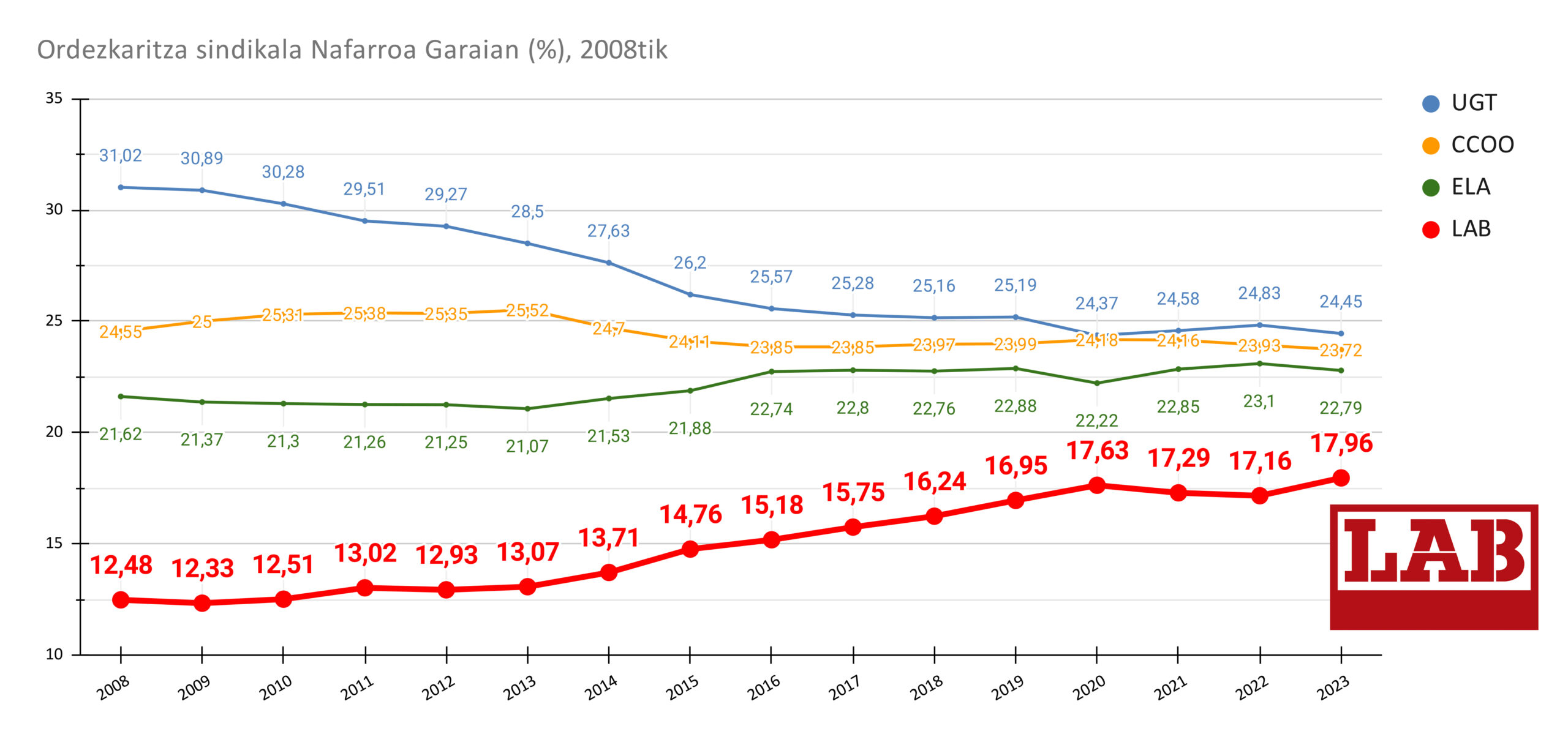 - 2008an LABek 18,54 puntura zuen UGT. Aitzitik, 2023an, 6,49ra. Hau da, 12 puntuko tartea jan dio azken hamasei urteetan. LAB izan baita, alde handiz, 2008tik 2023ra gehien hazi den sindikatua: 5,58 puntu egin ditu gora.