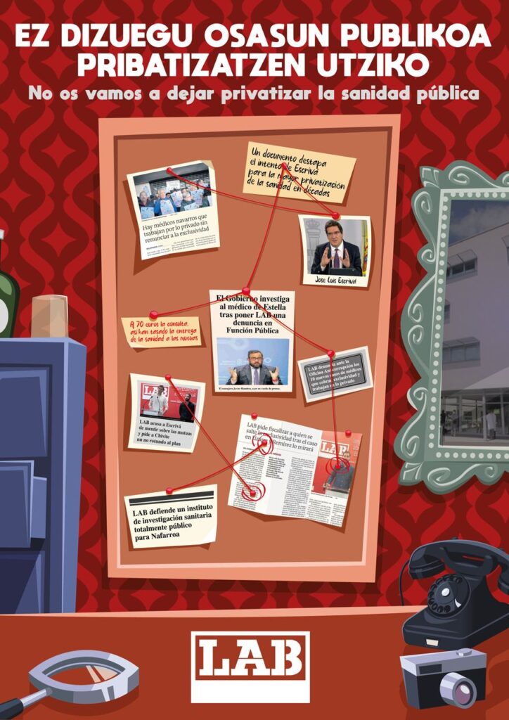 Gogoratuko denez, pribatizazio-estrategia horiei dagokienez, LABek, azkenaldian, esklusibotasunean praxi txarrak salatzeaz gain, osasun ikerketaren pribatizazioa ere salatu du. Azken horri dagokionez, Karrerak Carlos Artundori eta Alfredo Martinezi, osasun zuzendari orokorra eta Nafarroako Unibertsitate Ospitaleko gerentea hurrenez hurren, zuzendu nahi izan die ondoko mezua: “Osasun Departamentuak Navarrabiomed pribatizatzeko urratsak egiten jarraitzen du, arriskuen gaineko hausnarketa eta baloraziorik gabe. Utzi bide hori eta egin apustu Nafarroarako erabat publikoa den osasun ikerketako institutu baten alde”.
