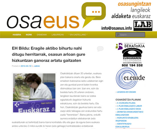 OSAEUS.info web orrian osasungintzan euskararen normalkuntzarekin lotura duten gaien berri emango dugu, LABen azterketa eta ekimenez gain, normalizazioan lagundu dezaketen dinamika, tresna eta azterketak ere bilduko dira. Lan tresna bat izatea da helburu, beraz, euskararen aldeko dinamikaren mesedetan LAB sindikatuak pertsona ororen esku martxan jartzen duen tresna.