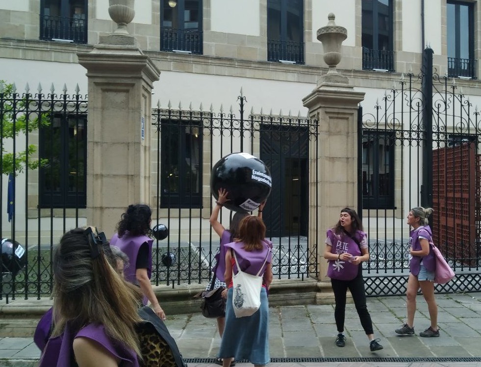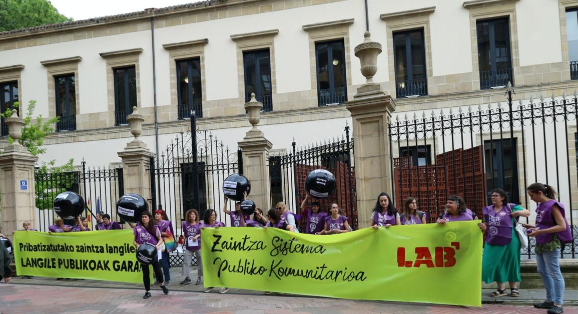 LABek ekintza bat egin du Eusko Legebiltzarraren aurrean, eta, hala, ekainaren 11n pribatizatutako zaintzako langileen izaera publikoa aldarrikatzeko mobilizazio nazionalera dei egin du.