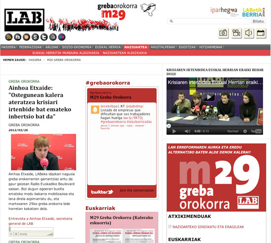 MARTXOAREN 29an Hego Euskal Herrian egingo den greba orokorraren inguruko albiste, euskarri eta arrazoiak zabaltzeko atal berezia osatu du LAB sindikatuak bere webgunean (http://www.labsindikatua.org/eu/hasiera/greba-orokorra).