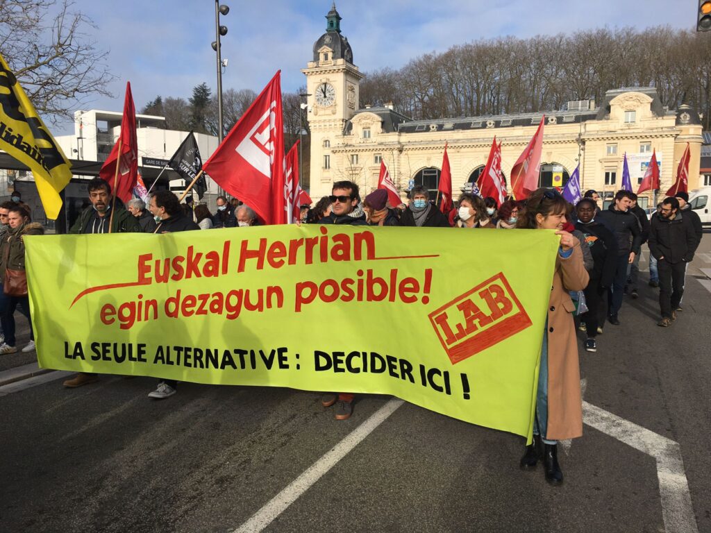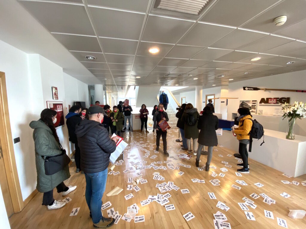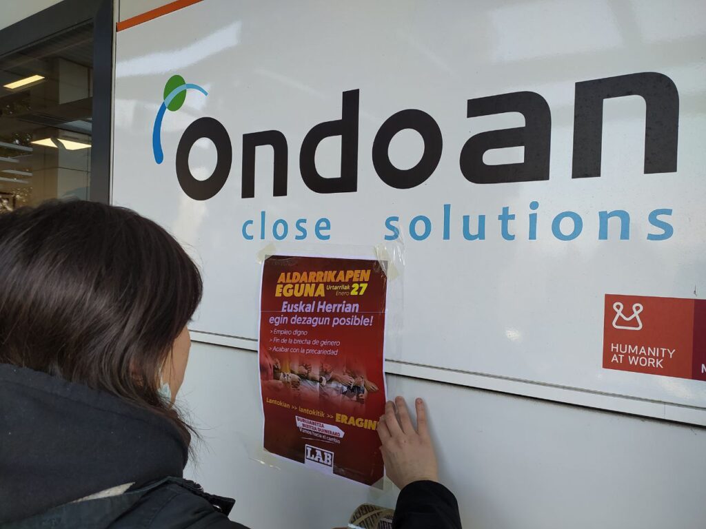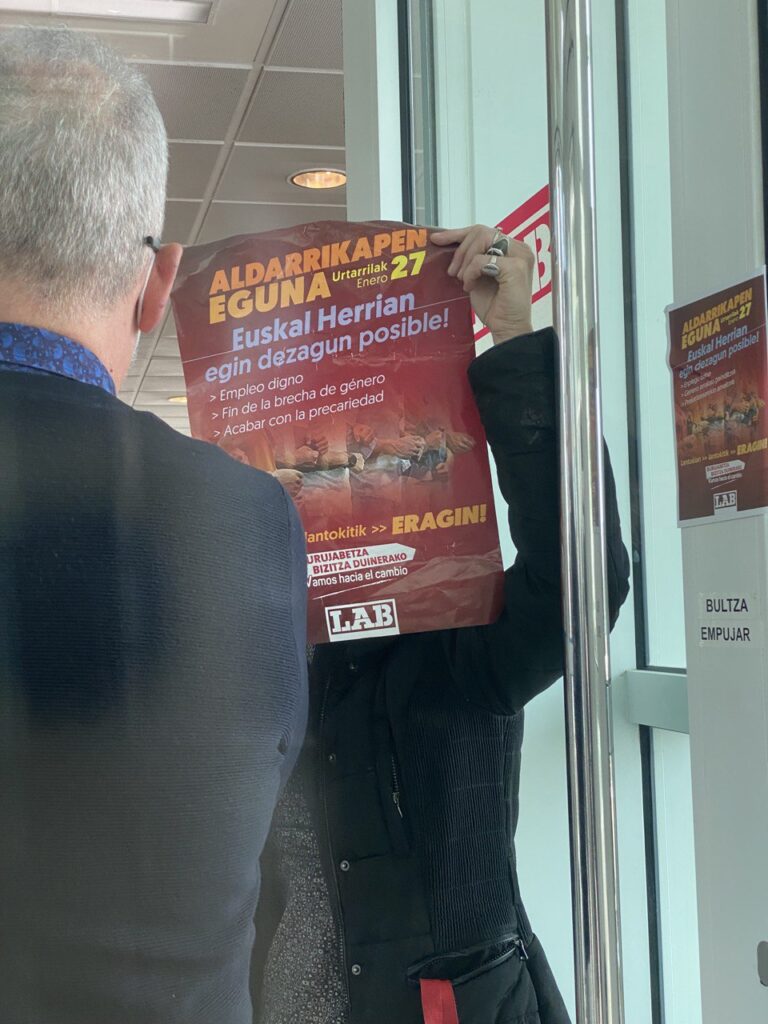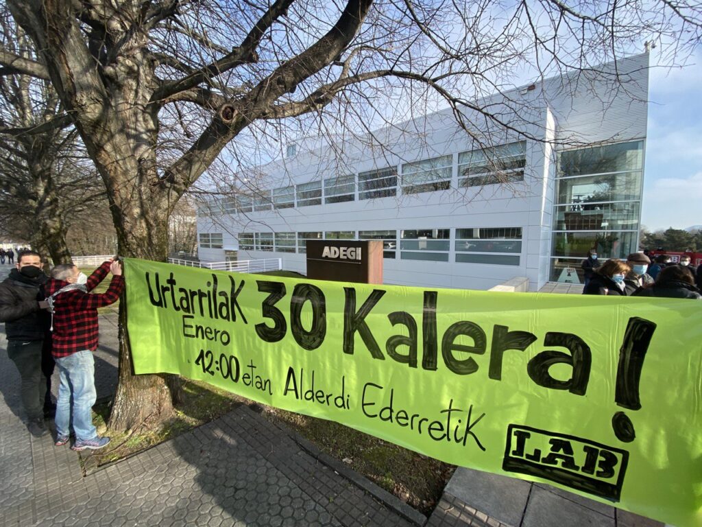 Aldarrikapen eguna egin dugu Ipar nahiz Hego Euskal Herrian. Ipar Euskal Herrian, Frantziako Gobernuak ezarri asmo dituen murrizketen kontrako grebaren testuinguruan, Baionako manifestazioan hartu dugu parte. Hego Euskal Herrian, berriz, hamaika ekintza egin ditugu, enplegu duina, prekaritatearen amaiera eta soldata arrakalaren ezabaketa aldarrikatzeko. Gipuzkoako enpresen elkarte ADEGIren egoitzaren parean, Donostian, LABeko idazkari nagusi ondoko Igor Arroyok mezu argi bat bidali dio euskal patronalari: “Lan erreforma honekin ez da bake sozialik izango”.