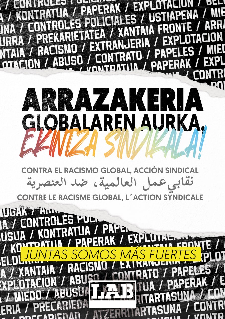 Arrazakeriaren eta Xenofobiaren Aurkako Nazioarteko Eguna izango da bihar, martxoak 21. Bada, LAB sindikalismo antiarrazista baterantz doa, lan-esplotazioa eta migrazioaren kriminalizazioa arbuiatzen ditu eta Hego eta Ipar Euskal Herriko gobernuei premiazko justizia eta erreparazio neurriak eskatzen dizkie.