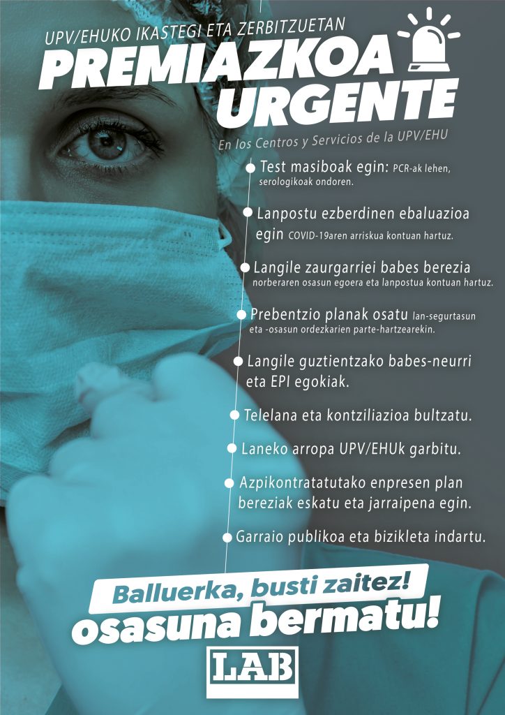 LABek UPV/EHUn duen atal sindikalak salaketa aurkeztu zuen atzo goizean Bizkaiko Lan Ikuskaritzan. Bertan, eskatzen dugu unibertsitatearen Administrazio eta Zerbitzuetako Pertsonalaren (AZP) jarduera presentzialera itzultzea geldiaraztea, harik eta salatutako eskubide-urraketak konpontzen diren arte eta langileen osasunerako eta segurtasunerako eskubidea modu eraginkorrean bermatzen den arte.