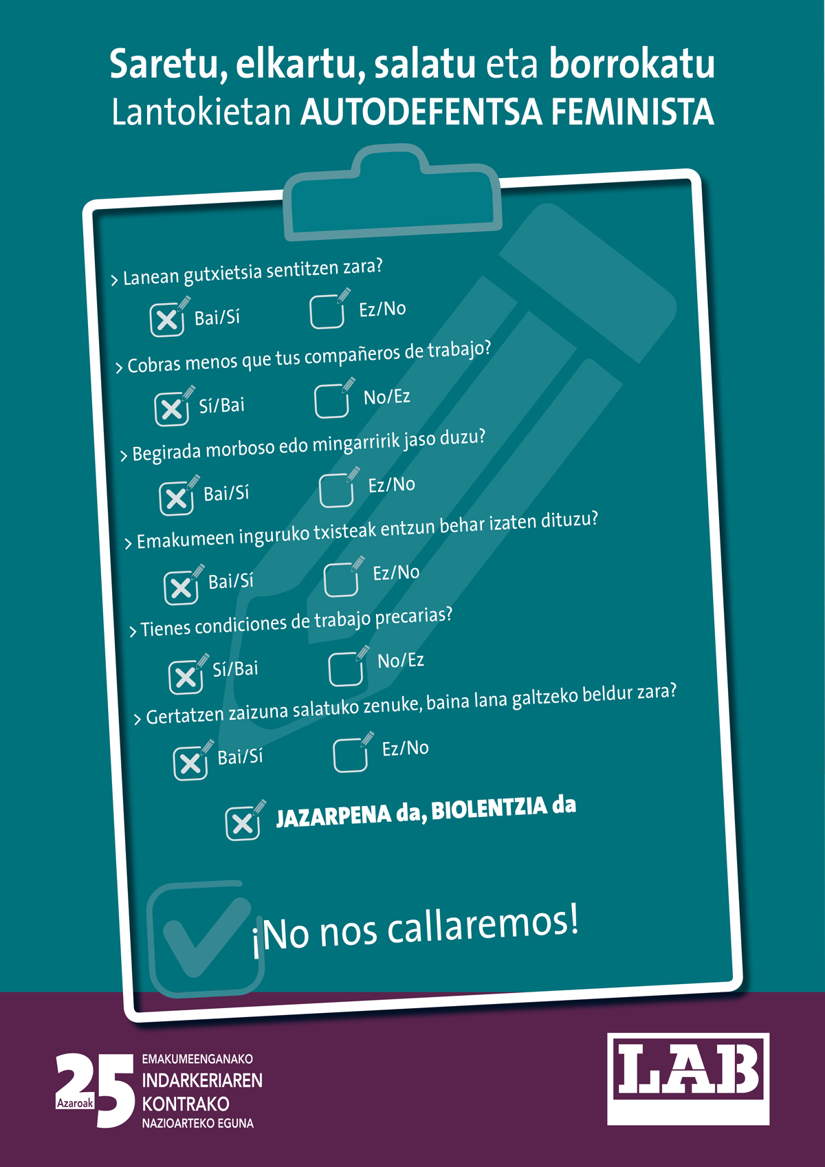 Emakumeok* argi daukagu, lantokietan autodefentsa feministara joko dugu eta ekintza sindikalarekin erasoei erantzungo diegu. Kontatzen ez dena ez da existitzen, horregatik guk gogor eta ozen oihukatuko dugu lantokietako pareta guztiak astinduz. Jazarpen eta erasoen aurrean ez gara isilduko, haserre gaude, eta amorru hori antolatuko dugu, saretuko dugu, eta erantzule guztiak seinalatuko ditugu. Enpresei gogorarazi nahi diegu ere, haien arduragabetasuna eta demagogia alde batera uzteko eta behingoz protokolo errealak enpresetan martxan jartzeko garaia dela.