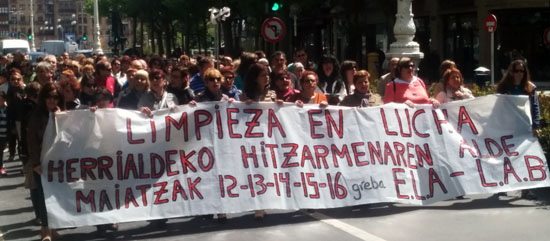 ELA eta LABek (alorrean %70ko ordezkaritzakin) maiatzak 12,13,14,15 eta 16rako greba deialdia egiten dugu Gipuzkoako garbitasunean. Htizarmenak 3000 lagunei eragiten die, alorreko erdia.