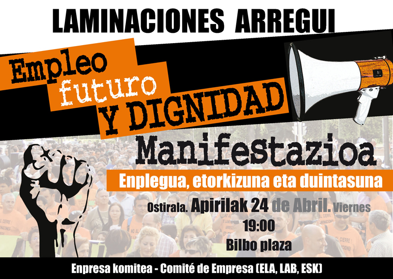 El comité de empresa de Laminaciones Arregui llama a secundar la manifestación que se celebrará el próximo 24 de abril Gasteiz en defensa del empleo. Bajo el lema "Empleo, futuro y dignidad" la movilización partirá desde la plaza Bilbao a las 19:00h.