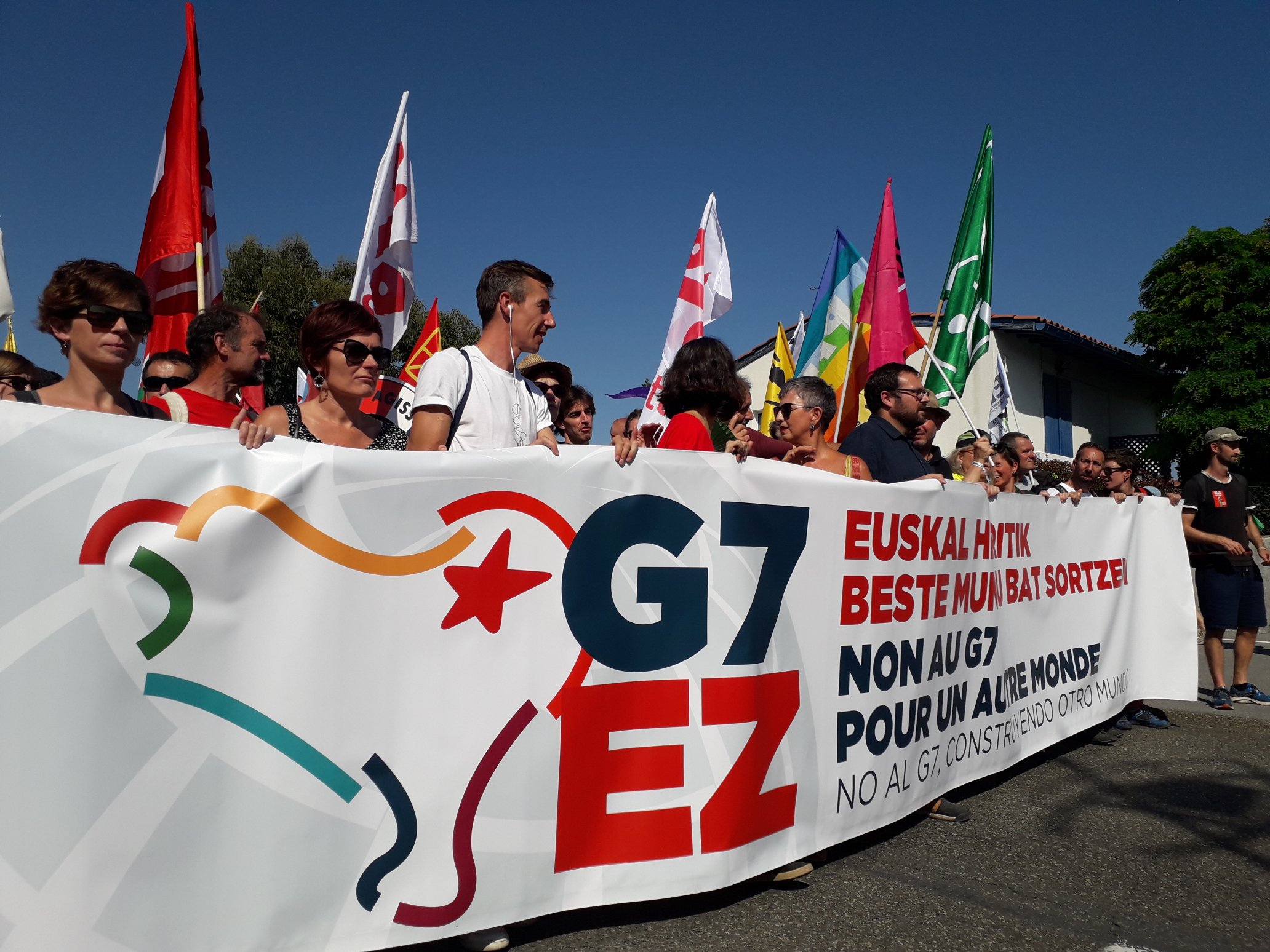 G7aren kontrako manifestazioa arrakastaz gauzatu da Hendaia eta Irun artean. Hain zuzen ere, 15.000 lagun inguru bete dute Hendaiako portua eta Irungo Ficoba arteko bidea, G7 EZ! plataformak deituta. Santiago zubian iritsi da une hunkigarriena, manifestariek mugak eta harresiak modu sinbolikoan eraitsi dituztenean. Behin Ficoban, Bidasoa ibaiaren bestaldean, kontragailurrean aritu garen mugimendu sozial, sindikal eta politikoek adostutako manifestua egin dugu publiko. Berriro ere kapitalismo neoliberalaren aurrean alternatibak ditugula nabarmendu dugu, demokrazia, elkartasuna eta emakume zein gizonen arteko parekidetasuna ardatz.