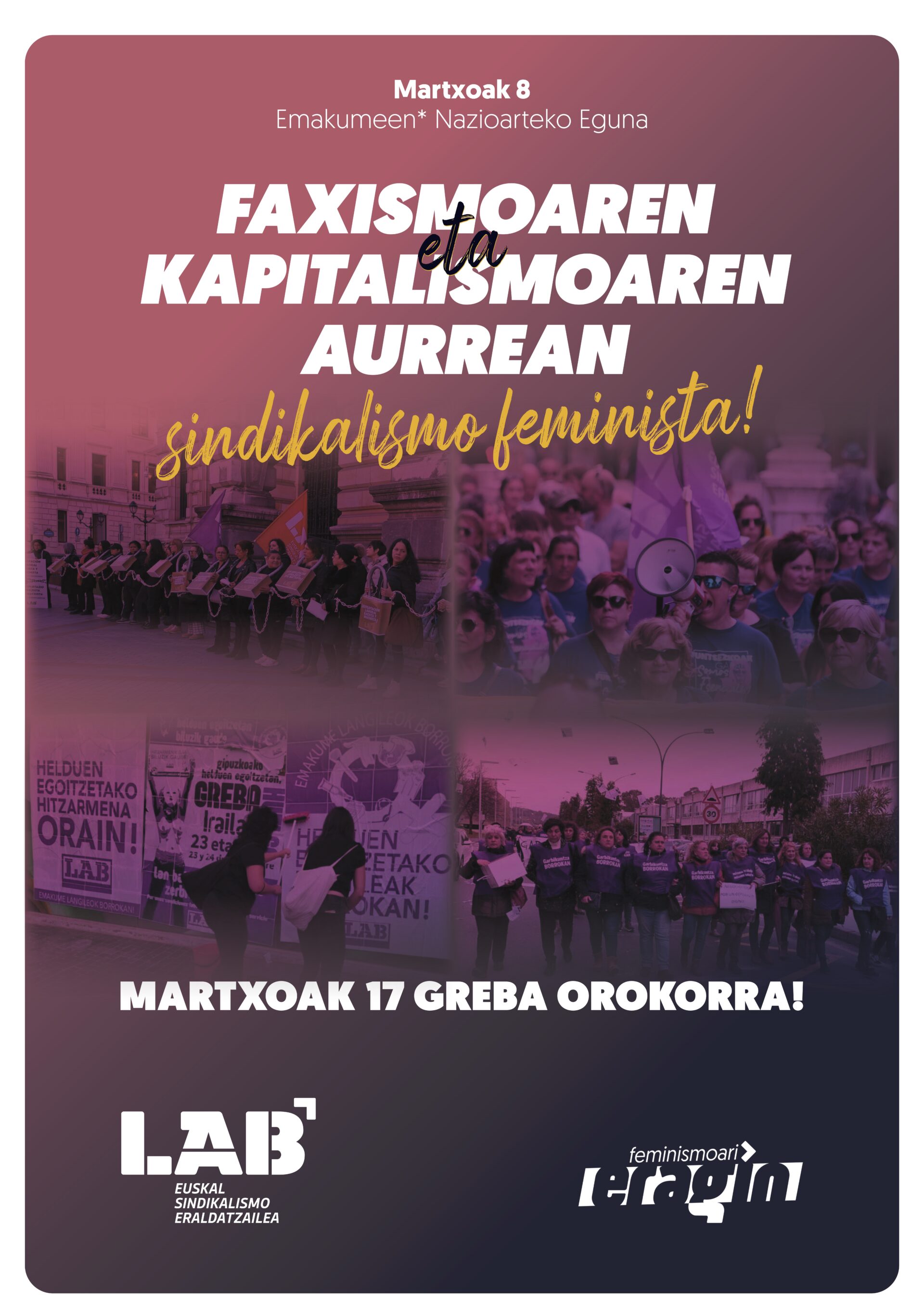 Sindikalismo feminista aldarrikatzeko eguna ere bada Martxoaren 8a, faxismoaren eta kapitalismoaren aurrean aliantza feministak eraikitzen jarraitzekoa. Autoritarismoaren eta faxismoaren eskutik datorkigun kapitalismoaren berrantolaketaren aurrean, kontraboterezko sindikalismo feminista da gure errezeta. Feminismotik posible da beste mundu bat.