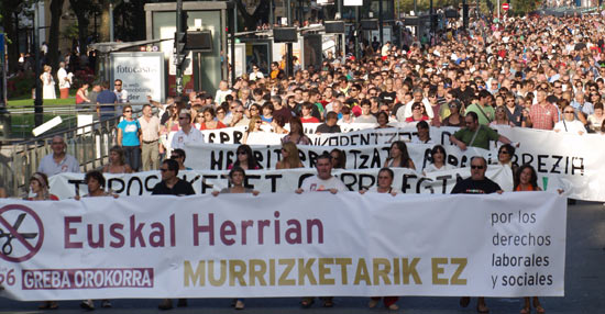 Milaka euskal herritar Madrildik inposatu nahi dizkiguten murrizketen kontra, eskubide laboral eta sozialen alde eta irailaren 26ko greba orokorrera deituz mobilizatu dira gaur Gasteiz, Donostia eta Bilbon.